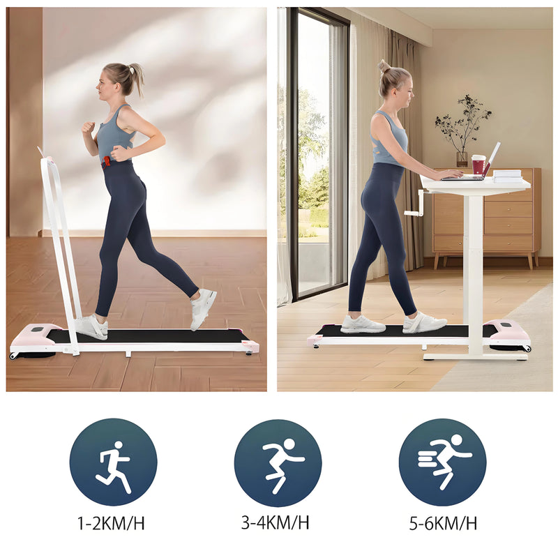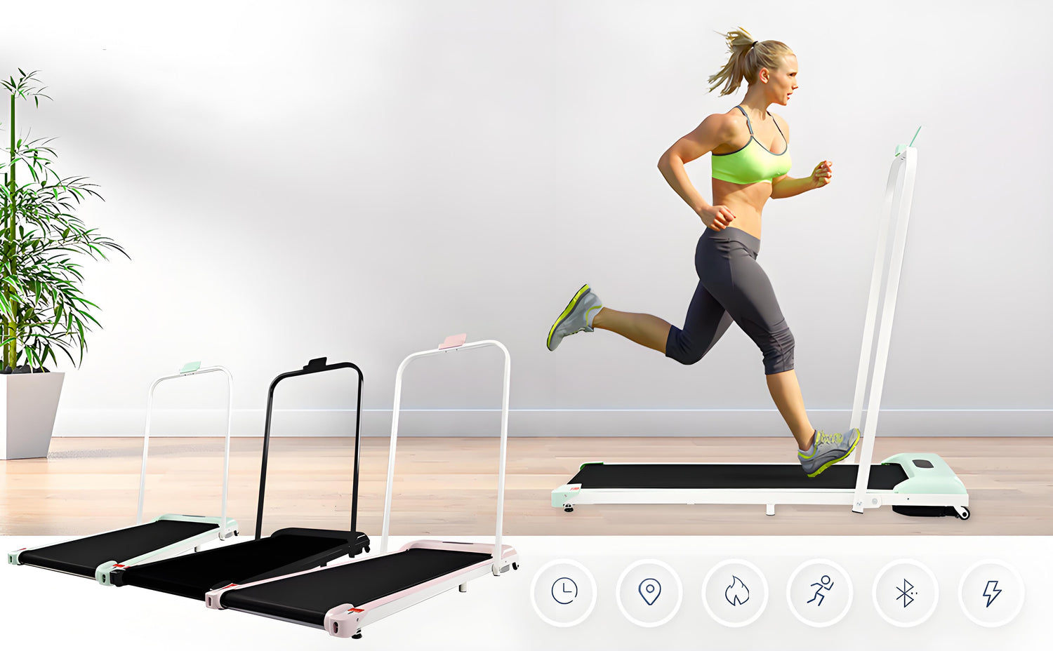 Fitvect M1F är en smart 2-i-1 lösning för både hem och kontor. Fäll ner handtaget för att promenera under skrivbordet, eller fäll upp det för en säker joggingtur. Utrustad med inbyggda Bluetooth-högtalare för musik, en tystgående Eco-motor och en ultratunn design (12 cm) som enkelt ryms under soffan eller sängen. Klar att användas direkt ur lådan – ingen montering krävs.